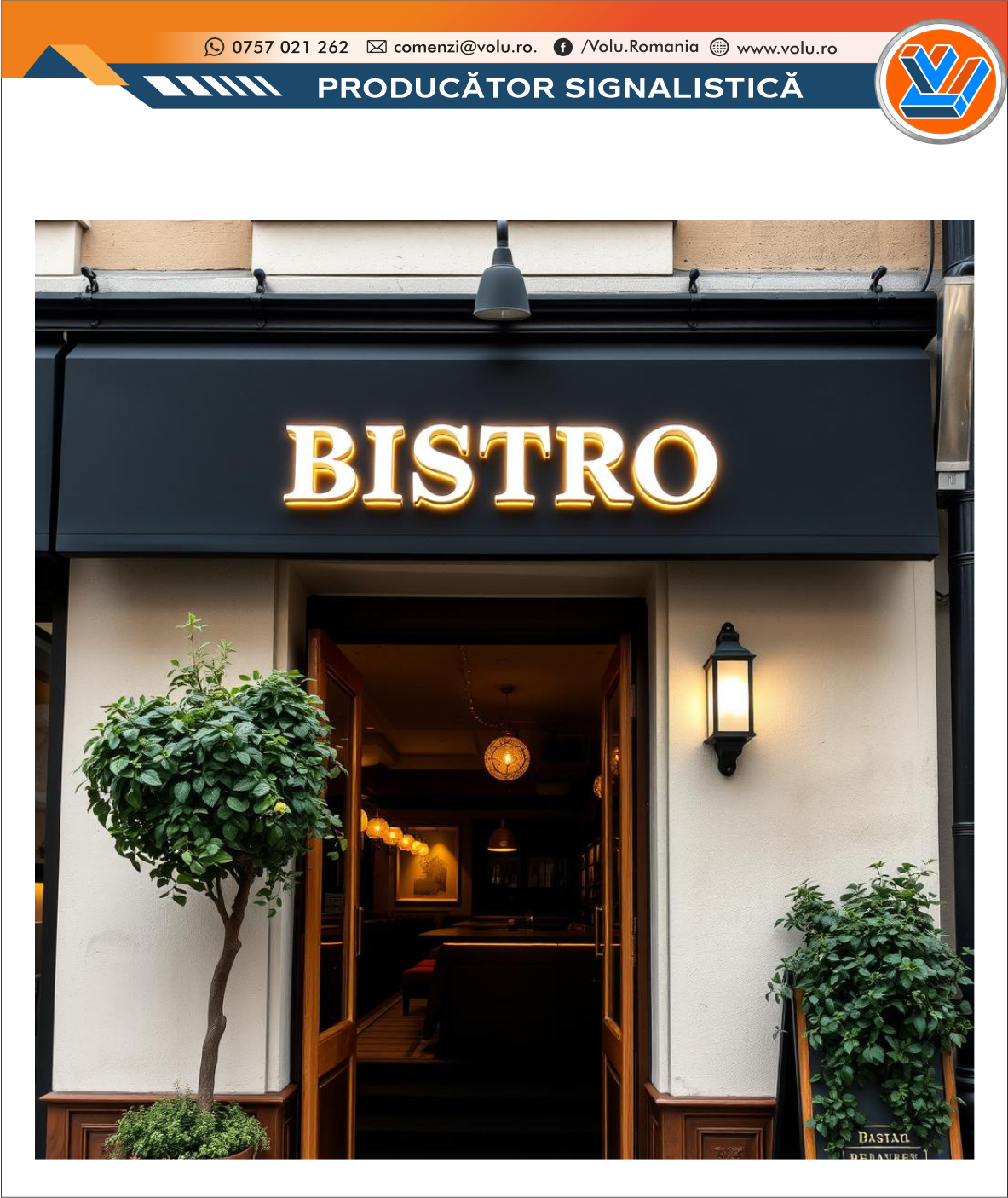 Literele Volumetrice Iluminate LED - personalizat Bistro, reprezintă una dintre cele mai eficiente și elegante forme de semnalistică publicitară, utilizate pentru a evidenția numele sau logo-ul unei companii, într-un mod vizibil, modern și profesionist. Au ca scop de a atrage atenția, crește vizibilitatea și a da un aspect premium unui brand, magazin, sediu de firmă sau eveniment fiind o metoda moderna de promovare.