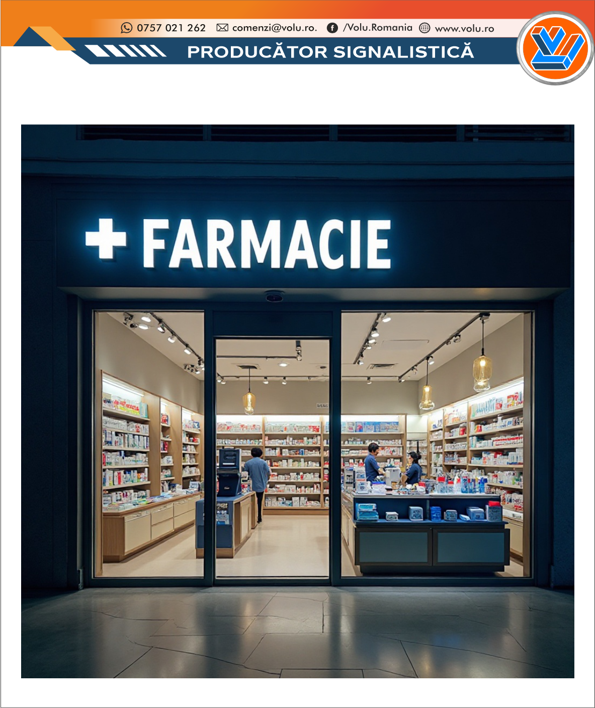 Literele Volumetrice Iluminate LED - personalizat Farmacie, reprezintă una dintre cele mai eficiente și elegante forme de semnalistică publicitară, utilizate pentru a evidenția numele sau logo-ul unei companii, într-un mod vizibil, modern și profesionist. Au ca scop de a atrage atenția, crește vizibilitatea și a da un aspect premium unui brand, magazin, sediu de firmă sau eveniment fiind o metoda moderna de promovare.