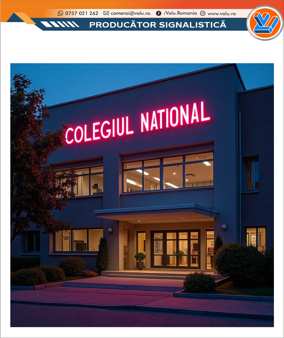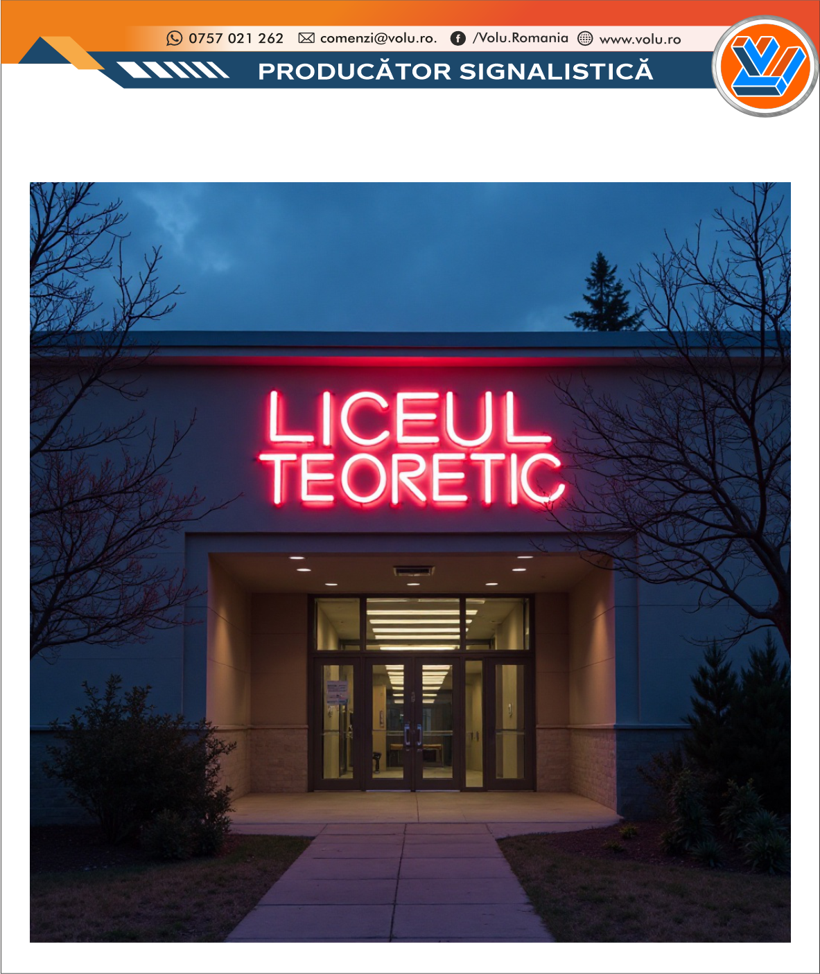 Literele Volumetrice Iluminate NEONFLEX - personalizat Liceu, reprezintă una dintre cele mai eficiente și elegante forme de semnalistică publicitară, utilizate pentru a evidenția numele sau logo-ul unei companii, într-un mod vizibil, modern și profesionist. Au ca scop de a atrage atenția, crește vizibilitatea și a da un aspect premium unui brand, magazin, sediu de firmă sau eveniment fiind o metoda moderna de promovare.