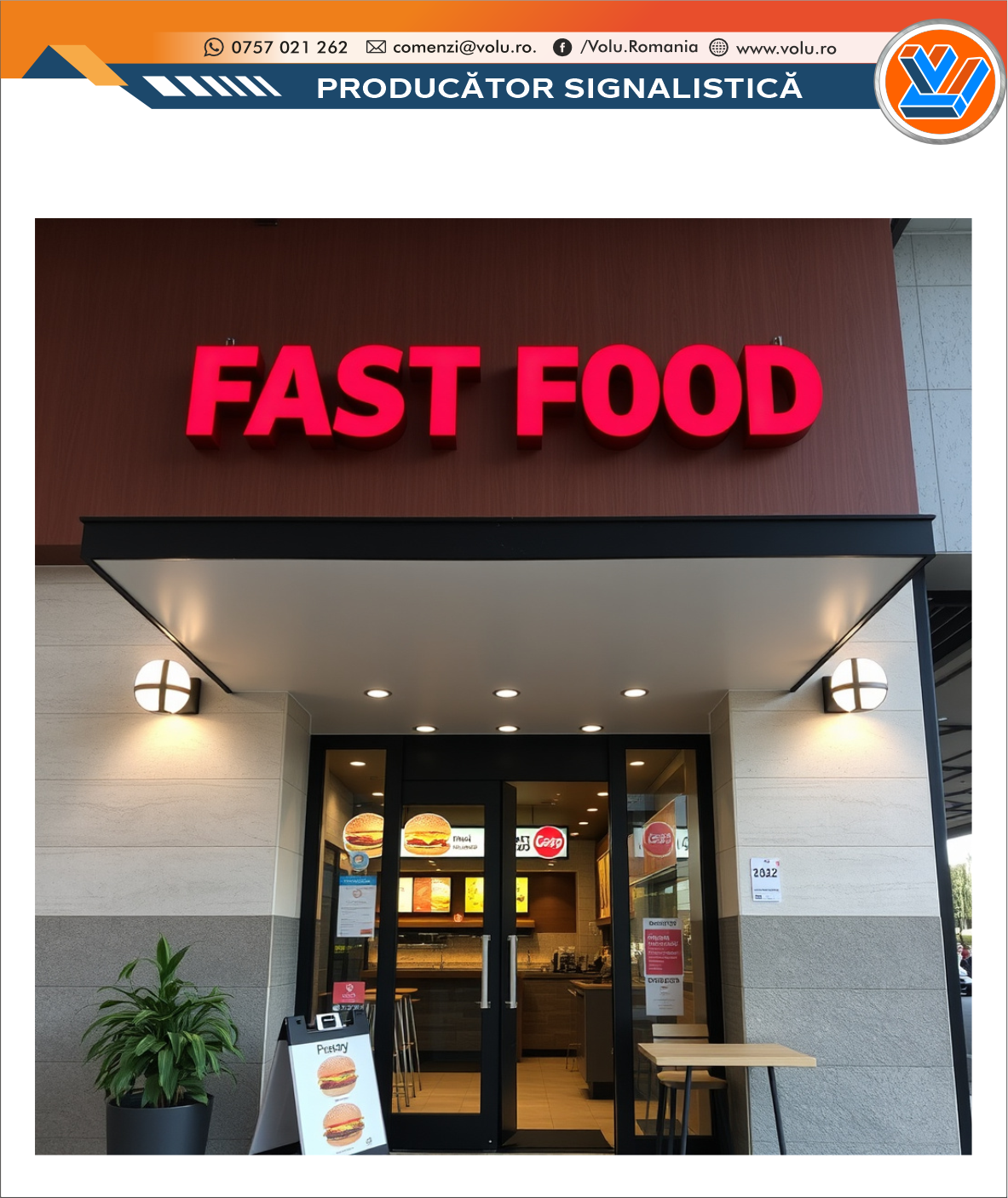 Literele Volumetrice Iluminate LED - personalizat Fast Food, reprezintă una dintre cele mai eficiente și elegante forme de semnalistică publicitară, utilizate pentru a evidenția numele sau logo-ul unei companii, într-un mod vizibil, modern și profesionist. Au ca scop de a atrage atenția, crește vizibilitatea și a da un aspect premium unui brand, magazin, sediu de firmă sau eveniment fiind o metoda moderna de promovare.