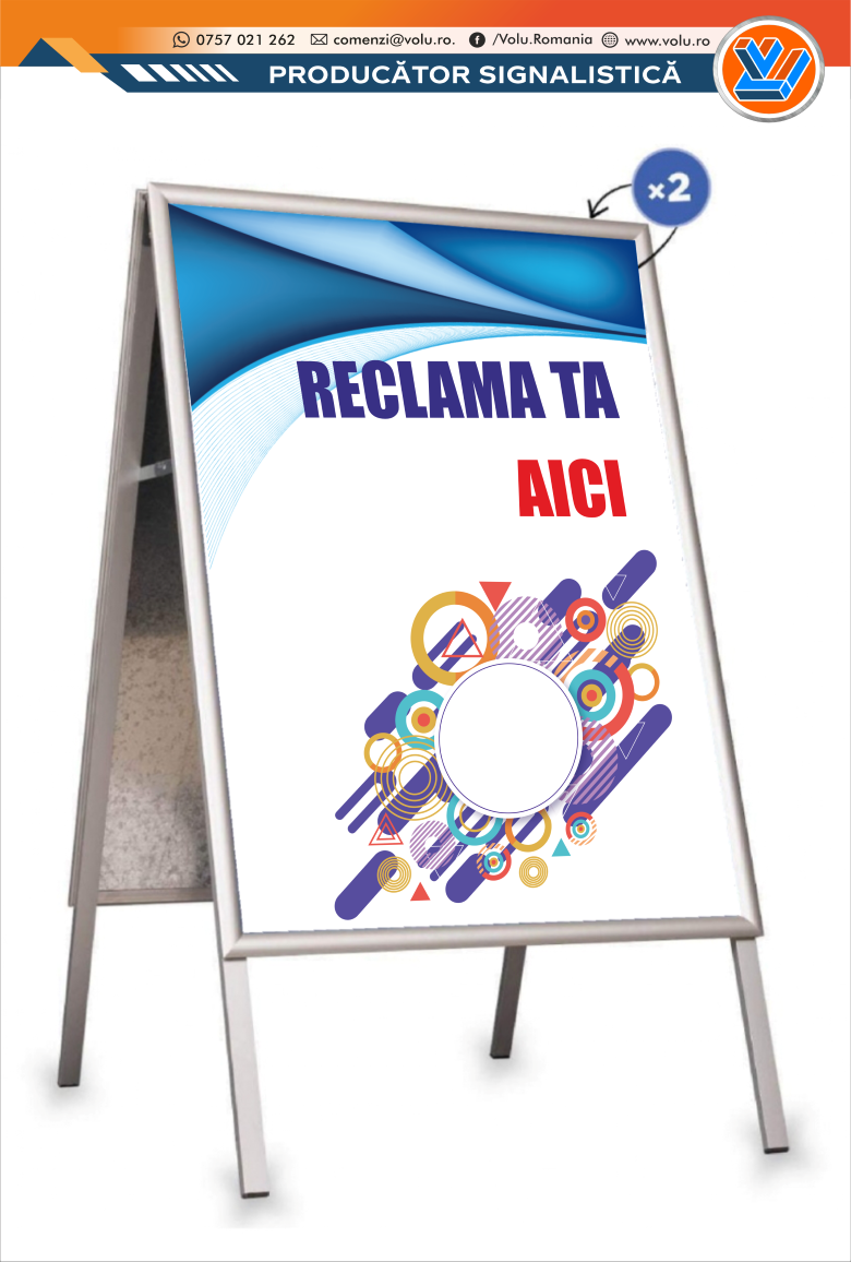 People Stopper/ panou stradal pietonal publicitar personalizat cu două fețe permite afișarea pe ambele parți a materialului publicitar.
